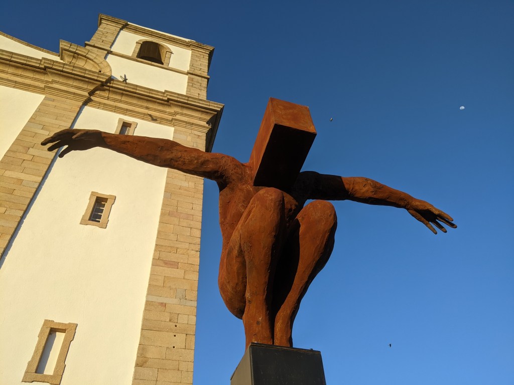 Tegen de witte muren en de blauwe lucht staken de bruingeroeste beelden prachtig af. Meer dan menshoog, ook door de sokkels. Wat de Portugezen ervan vonden weet ik niet. Wat ik ook niet weet is wie de maker is. Het is me niet opgevallen en ik heb er ook niet goed genoeg naar gezocht. Maar dat brengt me bij de vraag: gaat het om het kunstwerk of om wie het gemaakt heeft? Is iets mooier of interessanter als je weet aan wiens brein en creativiteit het te danken is? Voor de maker is het van groot belang, vermoed ik. Iets nalaten, dat zullen veel kunstenaars en schrijvers uiteindelijk wel willen.